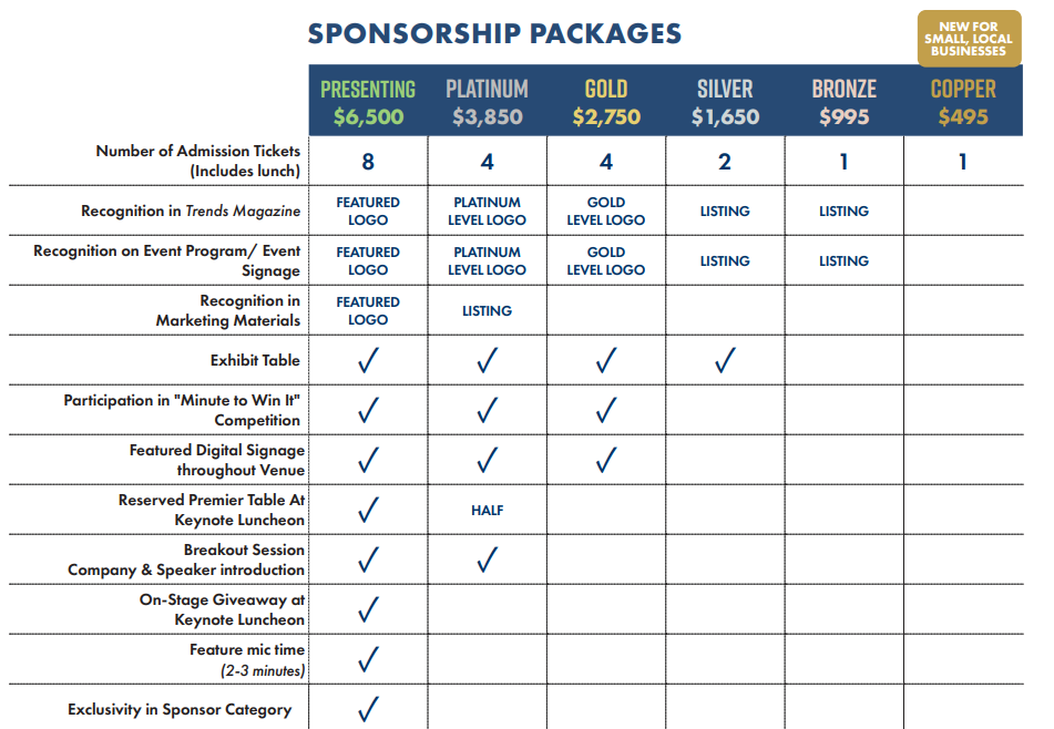 Premier exhibit space in vendor expo area 1 premier table for 8 at Keynote Lunch Recognition as “Presenting Sponsor” in all marketing materials, signage, event program, on screen and in trends Mic. time before the Keynote Lunch to present on your product (3-5 minutes) 1-2 minute introduction at 2 breakout sessions On-stage prize giveaway Minute To Win It Opportunity to place materials at each table |