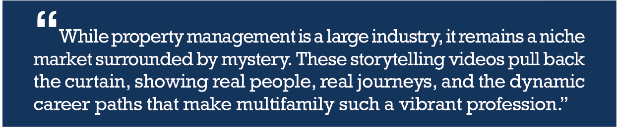 “A lot of people don’t fully understand the breadth of what we do,” says project co-producer Amy Mark. “There’s a misconception that apartment careers are limited to collecting rent or responding to maintenance requests. These videos help shift that narrative by highlighting the depth, purpose, and opportunity that truly define our industry.”