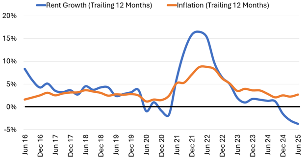 Since 2021, Denver has completed and delivered 70,000 apartments, an 18% increase in total inventory, and rents have responded accordingly.