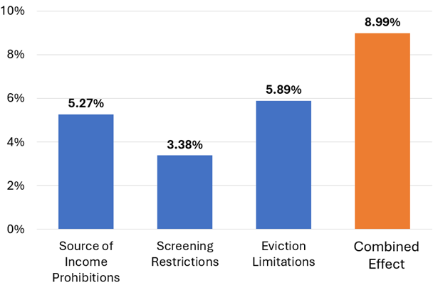 A recent study by MetroSight found that common regulations designed to protect residents, such as Source of Income Prohibitions and Eviction Limitations, resulted in increasing rents by between 3.4% and 5.9% when applied individually and by 9.0% when the policies were enacted together.