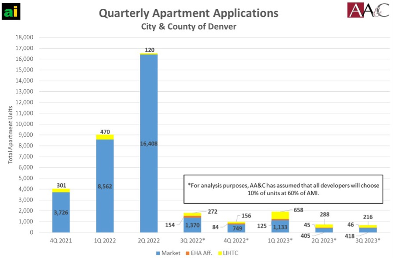 In 2023, Scott Rathbun, President of Apartment Appraisers & Consultants, showed that permit applications for market-rate apartments in Denver fell by 92% in the six months after the ordinance took effect on July 1, 2022. Permit applications fell to 2,119 units in the second half of 2022 as compared to 24,970 units during the first half.